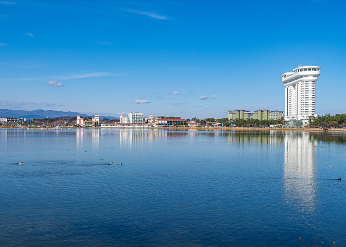 거울처럼 청정하고 바다처럼 넓은 호수, 경포호는 수면이 거울과 같이 청정하다고 하여 붙여진 이름으로 경포대와 함께 2013년 12월 30일 대한민국의 명승 제 108호로 지정되었습니다. 경포호와 인접한 경포대를 포함한 많은 누각과 정자가 있으며, 관동별곡의 정철은 관동팔경 중 이곳을 으뜸으로 쳤다고 합니다. 경포호 한 가운데에는 월파정과 우암 송시열이 쓴 조암이라는 글씨가 새겨진 새바위가 있으며, 경포호의 둘레는 약 8km, 평균수심은 약 2m정도 입니다.